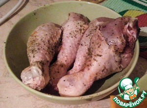 Голени моем. Посыпаем смесью перцев, карри, чесночным перцем, майораном, солим. Перемешиваем. Оставляем в сторону.
