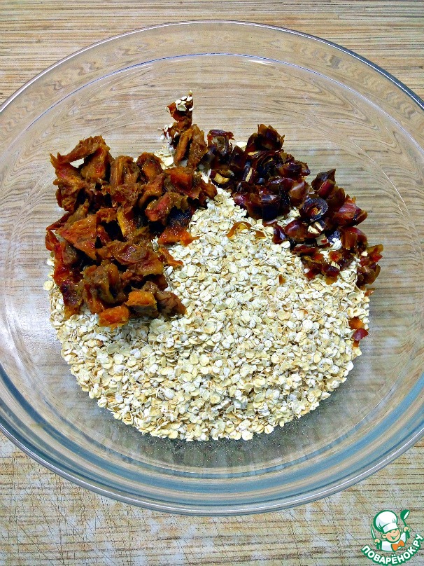 Отмерим нужное количество хлопьев, добавим порезанные сухофрукты. У меня финики и курага.