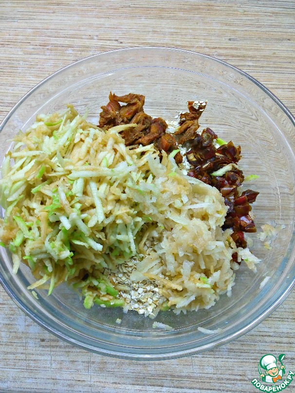 После добавим орехи, я использовала смесь из грецких и фундука. Яблоки и грушу трем на терке. С одного яблока я кожуру не сняла, но потом решила, что яблоко и грушу надо все-таки очистить.