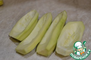 Из двух очищенных цуккини делаем лодочки и бланшируем их-опускаем в кипящую воду на 3мин. Больше нельзя, так как лодочки развалятся. Если у Вас кабачки "В возрасте" то бланшировать нужно чуть дольше!