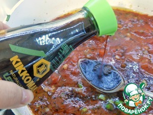 К специям выкладываем томаты в собственном соку, вливаем соевый соус. Доводим до кипения и выключаем.