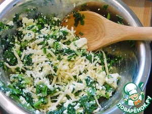 К шпинату добавляем мелко нарезанный адыгейский сыр и 50г натертого твердого сыра, все хорошенько перемешиваем.