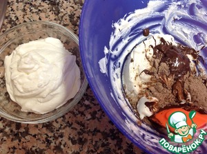 Разделить массу на две равные части, в одну часть добавить 50 г растопленного шоколада и какао-порошок, размешать