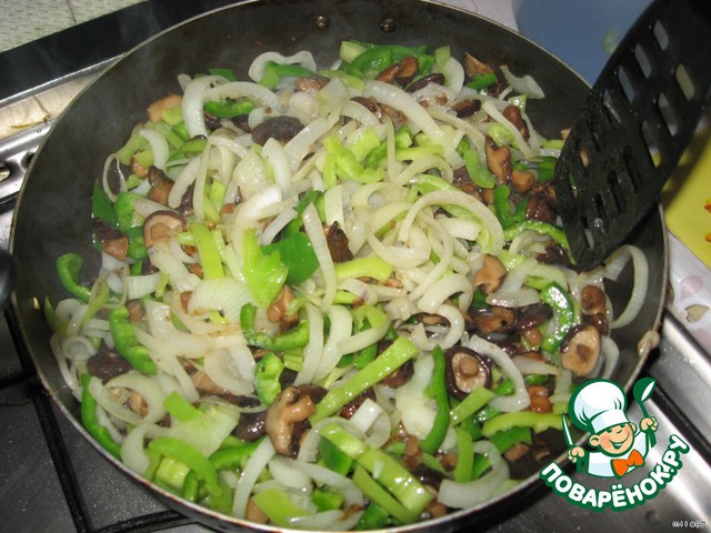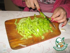 Режем перец соломкой, лучок полукольцами.