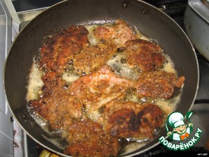 Обжариваем до золотистого цвета, хотя из-за кунжута курица получается темноватая.