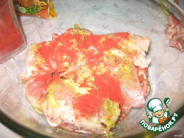 Тщательно посыпаем паприкой, приправой для курицы, я посыпала еще куринным бульоном и не солила. Оставляем в покое.