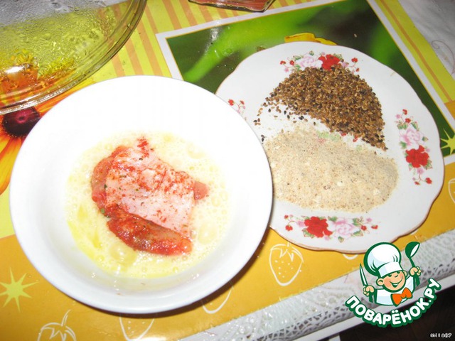 Теперь займемся курочкой. Взбиваем яйца, высыпаем на тарелочку сухари и кунжут и смешиваем ( можно и не смешивать). Окунаем курочку сначала в яйца затем в смесь сухарей и кунжута.
