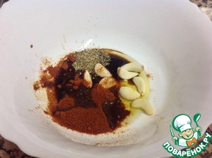 Подготовим маринад: 8 зуб. чеснока, паприку, 1ч. ложку бальзамика, соль, перец, оливковое масло и специи