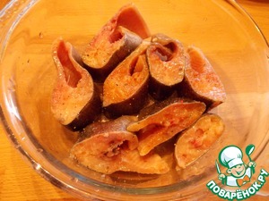 Рыбу выпотрошить, почистить, отрезать голову, плавники и хвост, нарезать небольшими кусочками. Посолить, поперчить, выложить в стеклянную форму для СВЧ, сбрызнуть лимонным соком.