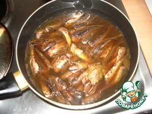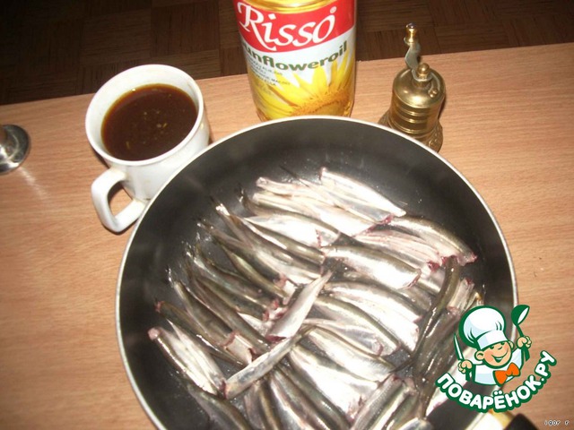 дал настоятся 15 мин.Растворил кубик овощного бульона,и,ВНИМАНИЕ!, 1 чл "Жидкого дыма" (привезли из Москвы,у нас не продается,наверно,жутко канцерогенная штука.Но ,почитав ,что идет в шпроты на заводах,был даже рад.Первое испытание и в мизерном кол-ве ).Взял листик лаврушки и грамм 100 - 150 подсолнечного масла, подготовил и разложил на сковородку.