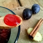 В горячее сливовое пюре добавляем пряности: 1/3 ч. л корицы, по 1/4 ч. л. гвоздики и кориандра и щепотку мускатного ореха. Я провожу им по терке буквально 3-4 раза.