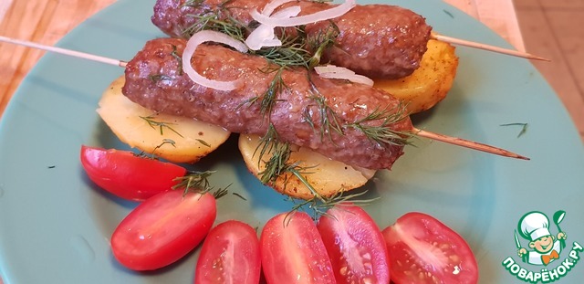 Укладываем на противень,на картошку. Желательно, чтобы люля не соприкасались между собой.Духовку разогреваем до180 гр, помещаем туда противень. Через 15 минут переворачиваем кебабы румяной стороной вниз...