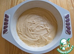 Муку смешиваем с разрыхлителем, просеиваем и вмешиваем в тесто. Оно должно получится довольно густым. Форму (22 см.) смазываем растительным маслом и выкладываем в нее тесто. Разравниваем ложкой. Отправляем в разогретую на 180 градусов духовку на 20-25 мин.