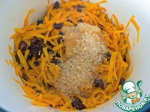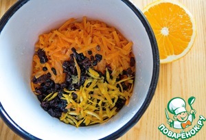 Пока корж остывает, можно заняться приготовлением мюсли. Натертую морковь, чистый изюм, цедру и сок апельсина ставим на огонь. После того, как масса закипит, делаем маленький огонь, накрываем крышкой и варим 20 мин.