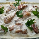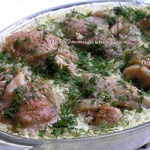 Когда соус НАЧНЕТ ЗАКИПАТЬ, достаем и даем постоять 5 мин., чтобы блюдо слегка остыло и пропиталось. Перед подачей посыпать зеленью петрушки. Наша "Курица с чесноком на рисе " готова!