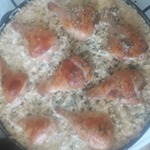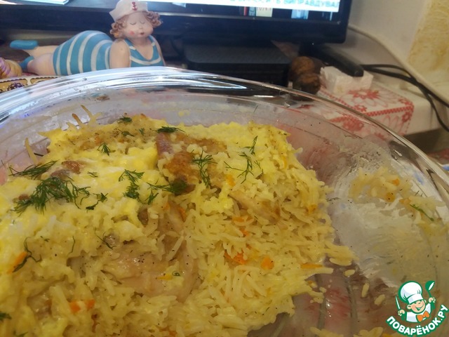 Юрий использует порубленную целую курочку, я же взяла голени. Нужно брать то, что даст сок. Т. е., использовать одни крылышки - не самый лучший вариант. Итак, курицу солим, перчим, выкладываем на рис, сбрызгиваем растительным маслом и отправляем в разогретую до 180 градусов духовку, до готовности риса. У меня на это ушло 50 мин. ДАЛЕЕ Я ОПИШУ ОЧЕНЬ ВАЖНЫЙ МОМЕНТ. Прочтите обязательно!! Нужно не допустить пригорания риса. Т. е., воду при необходимости нужно подливать. Почему бы не налить побольше сразу? Как говорит Юрий, нужно, чтобы рис попутно "омывался" и соками курицы. Я подливала воду два раза через каждые 20 мин. Почти до такого же уровня, как и первый раз. На 50-й минуте рис был готов.