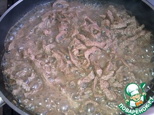 Как только чеснок на сковороде начнет потрескивать, добавить мясо и жарить на сильном огне 5-7 минут, помешивая.