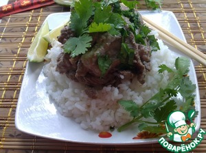 Мясо снять с плиты, выложить на тарелку и добавить к нему приготовленный арахисовый соус. Посыпать мелко нарезанной кинзой, сбрызнуть соком лайма. Подавать с отварным рисом. Приятного аппетита!