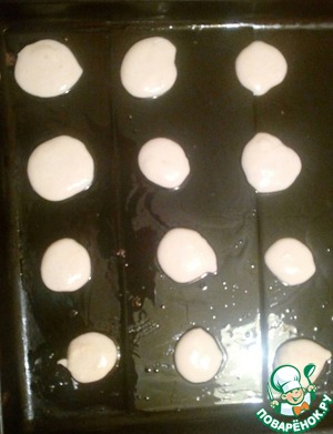 Смазать противень растительным маслом и небольшими порциями выкладывать тесто (оно имеет особенность растекаться, поэтому выкладывайте его на достаточном расстоянии друг от друга)