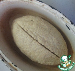 Формируем хлебушек желаемой формы, делаем острым ножом надрез, кладем на противень (у меня толстостенная жаровня) и отправляем выпекаться в разогретую до 200 градусов духовку.