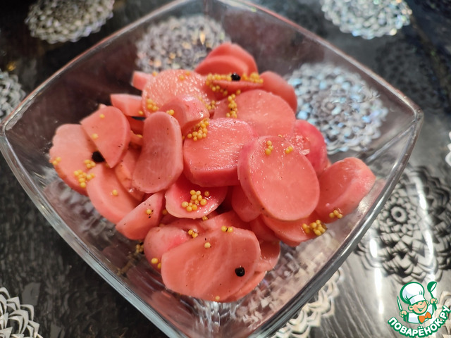 Хочу представить Вашему вниманию рецепт редиса в интересном, пикантном маринаде. Могу назвать следующие достоинства этой закуски: 1) готовится чрезвычайно быстро; 2) готова к употреблению уже через 10 минут после маринования; 3) редис получается вкусным, хрустящим, в меру острым.