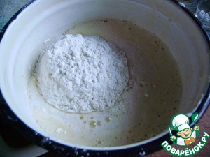 Добавить растительное масло, сыворотку, соду гашеную уксусом и муку. Все хорошо смешать.