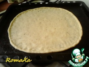 Раскатываем тонко тесто, перемещаем на противень и пальцами формируем бортики