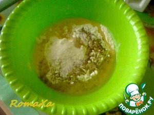 Берём удобную для замеса теста ёмкость, всыпаем муку, дрожжи, соль, сахар, специи, добавляем масло