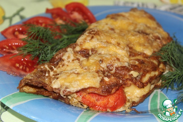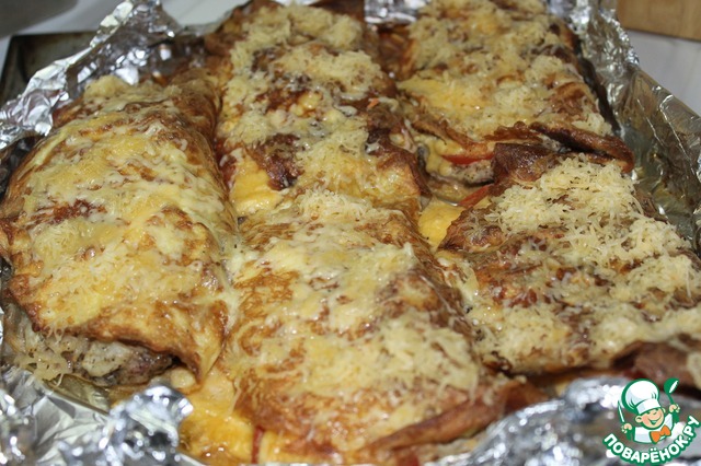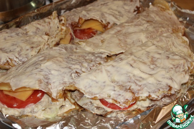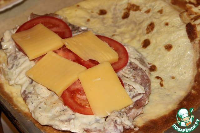 На каждую половину блина положить куски мяса. Сверху распределить маринованный лук, по два кружочка помидора и по ломтику сыра. -
