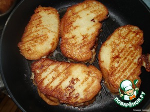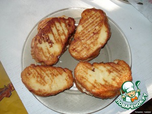 Разогрейте на сковороде 50г. слив. масла с 2 ч. л. раст. масла. Жарьте на сильном огне 3-4 минуты с одной стороны до румяной корочки. Уменьшите огонь, переверните сандвичи и подрумяньте с другой стороны. У меня на сандвичах получился небольшой узор в полоску, это из-за ребристости на сковороде.