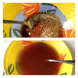 В пиале смешать томат-пасту, соевый соус и специи. Добавить воды и хорошо перемешать