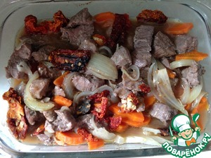 Через 10 минут достать мясо, перемешать. Добавить томаты сушеные и влить соус. Отправить еще на 10 минут в СВЧ, накрывать крышкой не надо.
