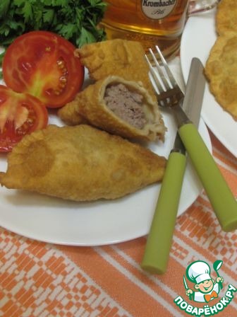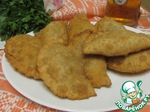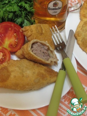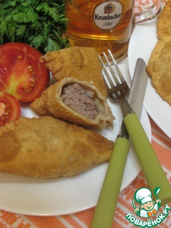Предлагаю свой вариант приготовления чебуреков на пиве. На сайте есть подобный рецепт, но пошаговых фото в нем нет, а так же нет фото готового блюда. Беру на себя смелость выложить свой рецепт в цветах и красках. Тесто на пиве более эластичное, не рвется и работать с ним одно удовольствие. Готовые чебуреки с хрустящей корочкой, внутри мясной сок, хороши не только в горячем виде, но и в остывшем.