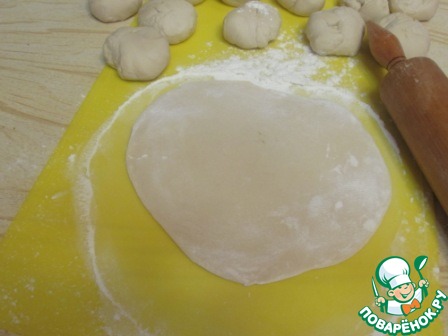 Тесто разделить на одинаковые по размеру кусочки, раскатать в тонкий круг.