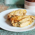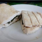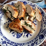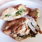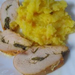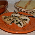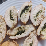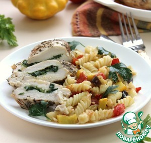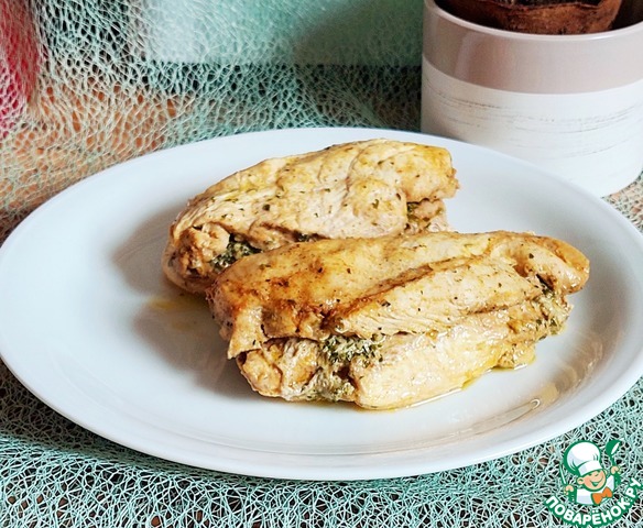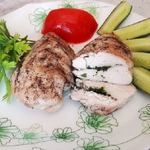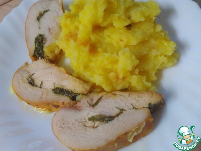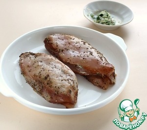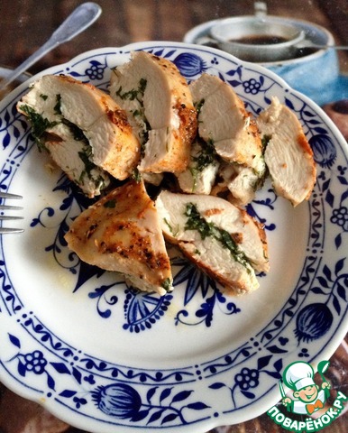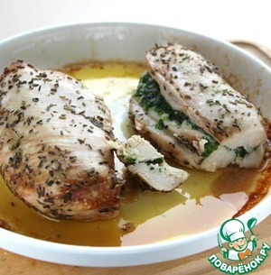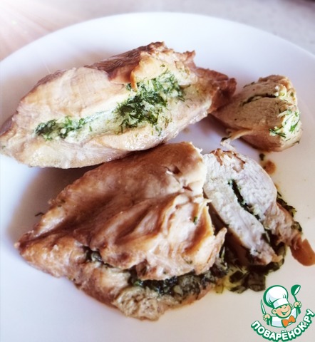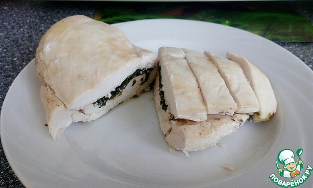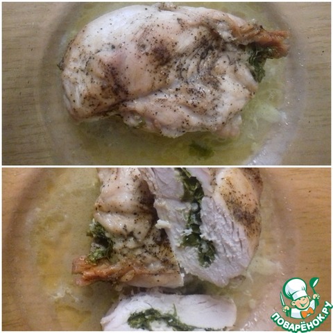 Куриное филе разрезать вдоль, не прорезая насквозь, и развернуть, как книжку. Положить на одну половину филе начинку и прикрыть второй половиной.