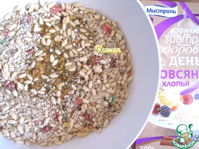В большой посуде смешиваем "Овсяные хлопья с Отрубями" от ТМ Мистраль, цукаты, вишню, орехи, семечки, воздушный рис. Добавляем столовую ложку кунжутной муки, пряности и снова всё перемешиваем.