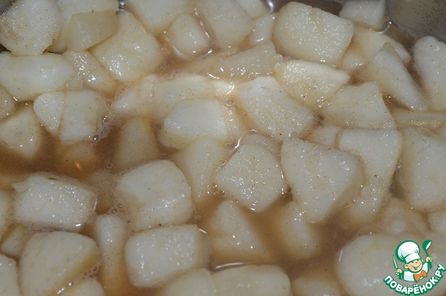 Груши почистить, удалить сердцевину и нарезать кубиком. Положить в кастрюлю, добавить оставшиеся 2 ст. л. сахара, корицу, лимонный сок, воду и слегка припустить. По желанию можно добавить немного изюма. Остудить.