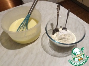 Муку смешиваем с содой. Постепенно начинаем добавлять в тесто и взбивать венчиком, чтобы не было комков.