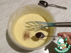 Итак: сливочное масло смешиваем с сахаром. Вымешиваем до однородности. Добавляем яйца, взбиваем. Теперь очередь кефира. Вливаем и еще раз взбиваем.