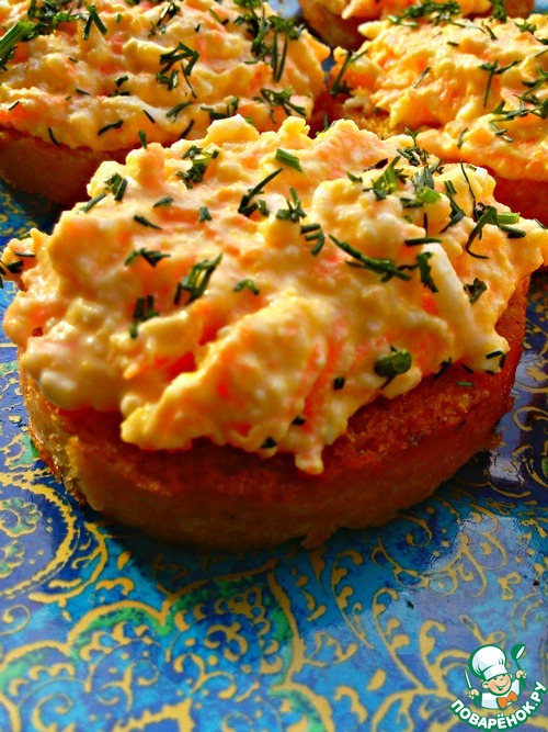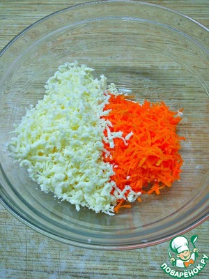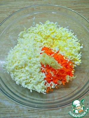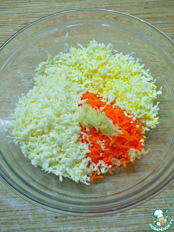 Сыр натереть, чеснок очистить, пропустить через пресс, добавить к моркови с яйцом. Перемешать.