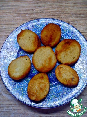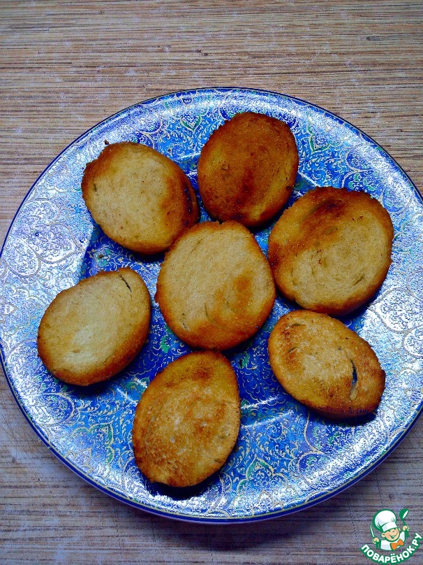 Багет нарезать ломтиками и поджарить на растительном масле до золотистой корочки.