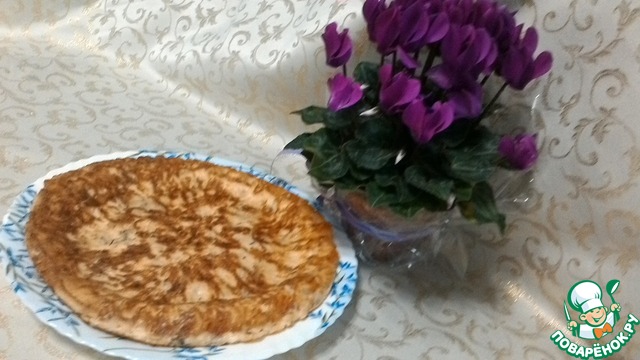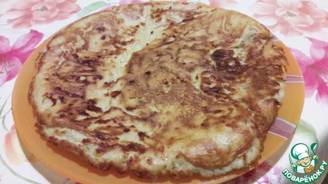На разогретое масло вылить получившееся тесто, разровнять лопаткой. Жарить под крышкой на среднем огне 3-5 минут с одной стороны, затем перевернуть и жарить еще 3-5 минут без крышки.