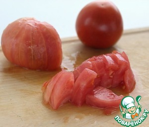 Помидор ошпарить кипятком, затем его под холодную воду, снять шкурку и нарезать.