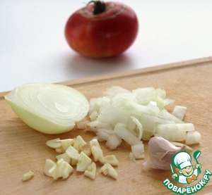 Измельчить чеснок, нарезать луковицу, как душе угодно.