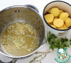 Растопить в кастрюле 40г сливочного масла и обжарить в нем 1 нарезанную луковицу. -