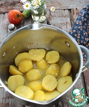 Добавить 400 г картофеля, залить небольшим количеством воды, чтобы только едва прикрывало картофель, положить букет гарни (связать в пучок подходящие травы) посолить, поперчить и тушить на медленном огне до готовности. Подавать горячим, полив соусом, в котором он тушился.