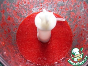 Желатин замочить в холодной кипячёной воде на 40 минут. После чего растопить в микроволновке (20 секунд при мощности 750Вт)или удобным для Вас способом. После этого клубнику (4 шт) и сахар положить в чашу блендера и измельчить в пюре