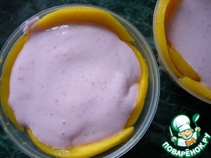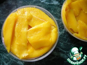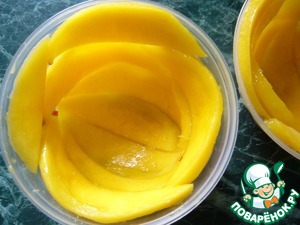 Порционные формочки (размер моих формочек в верхнем диаметре 9 см и высотой 6 см)смазать тонким слоем растительного масла (или застелить пищевой плёнкой). Уложить очищенное от кожи и нарезанное (острым ножом! )тонкими кусочками (2-3 мм)манго. Манго надо укладывать плотно долька к дольке, начиная снизу, потом по бокам, к верху, укладывая одну дольку на другую без нахлёста и, чтобы не было просветов, иначе масса вытечет и будет не красиво! В общем манго очень податливый фрукт, и он сам "примет и займёт" нужное положение. Обязательно должны остаться кусочки манго для закрытия десерта