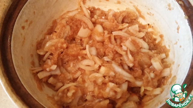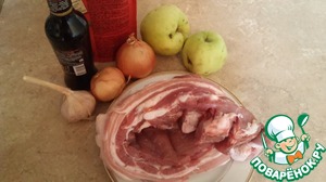 Приготовим маринад - лук нарезать 1/4 кольцами (или как Вам нравится), чеснок пропустить через пресс. Яблоко очистить от кожуры, натереть на мелкой терке. Выкладываем все в кастрюлю (я беру сразу ту, которую отправлю в духовку), добавляем соль, соевый соус, сахар, кетчуп, чуть свежемолотого перца и перемешиваем.