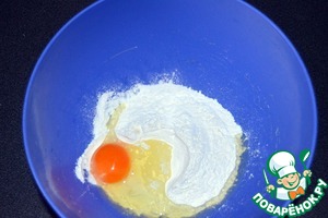Стакан муки высыпаем в подходящую емкость. Вбиваем одно яйцо.